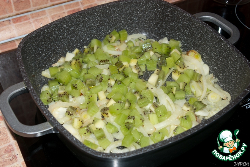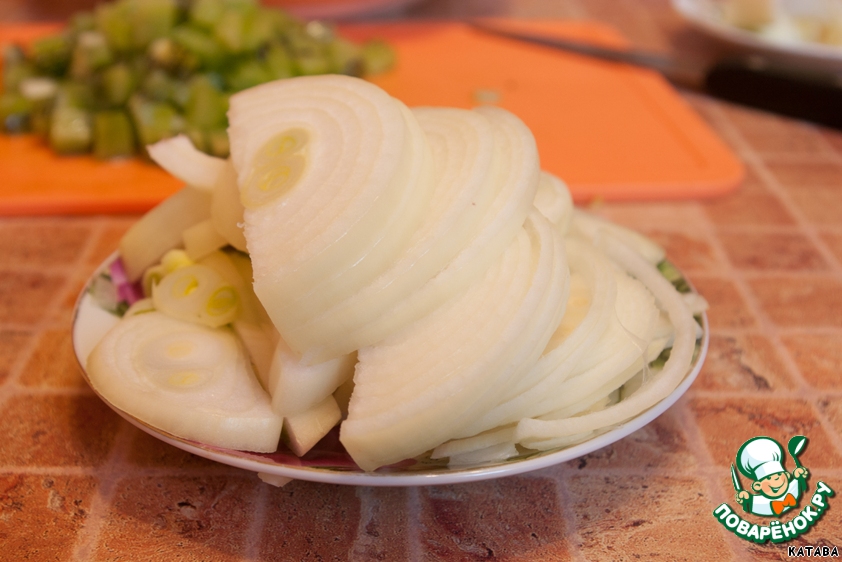Тем временем, обжариваем в ложке оливкового масла лук до золота