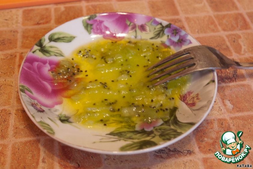 В блюдце вилочкой растолочь в кашицу несколько кубиков киви, добавить 1 столовую ложку оливкового масла, соли, перца.