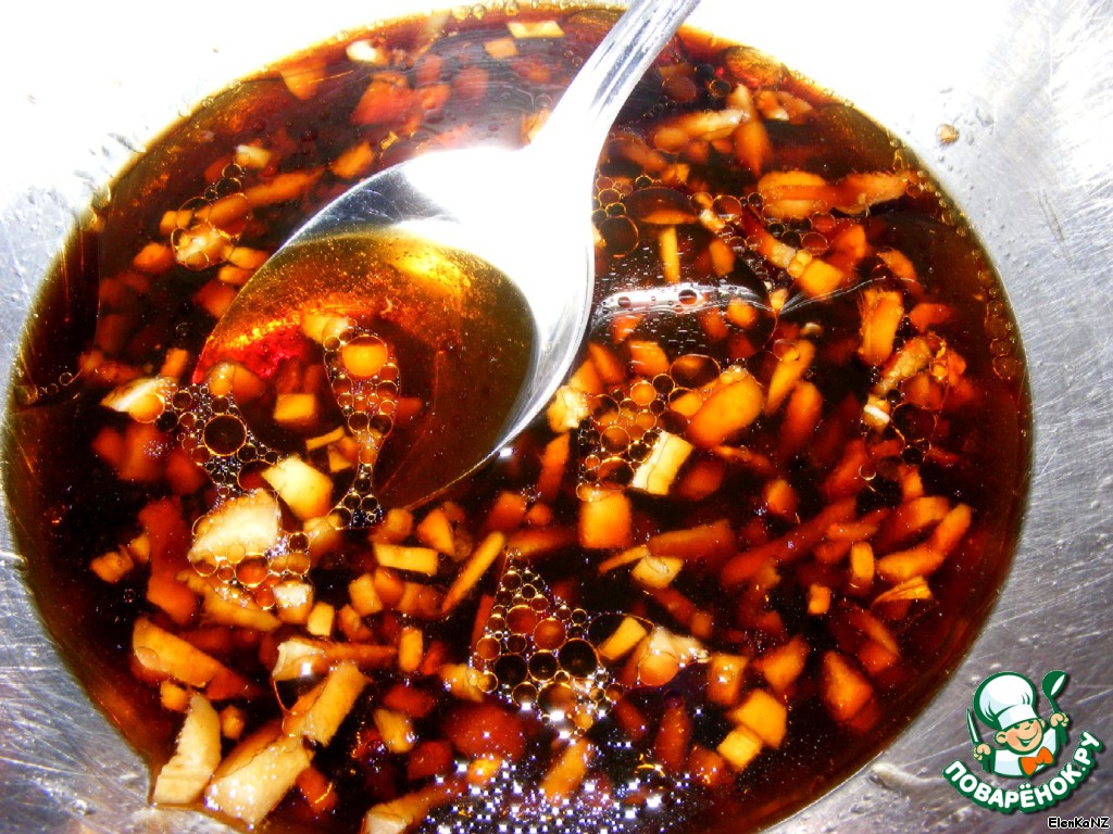 Для соуса смешать имбирь, чеснок, рисовое вино (можно заменить шерри), соевый соус, кунжутное масло и сахар.