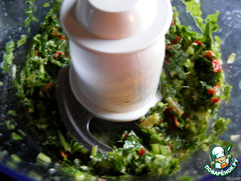 Для соуса в блендере смешать кинзу, имбирь, чили, масло и сок лимона до состояния пасты. У меня не получилась паста, было мало кинзы.