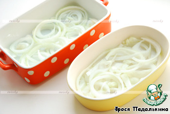 Рыбу заранее разморозить. Лук нарезать кольцами и выложить на дно формы.