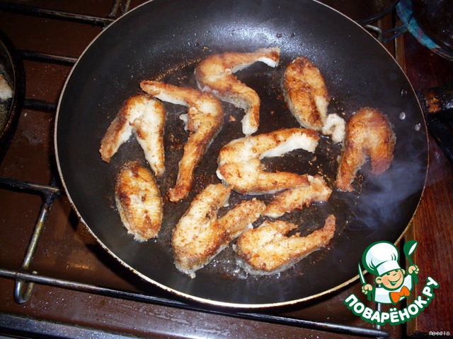 На разогретую сковороду, пролитую маслом выкладываем кусочки щуки и обжариваем сначала с одной стороны (до золотистой корочки)...