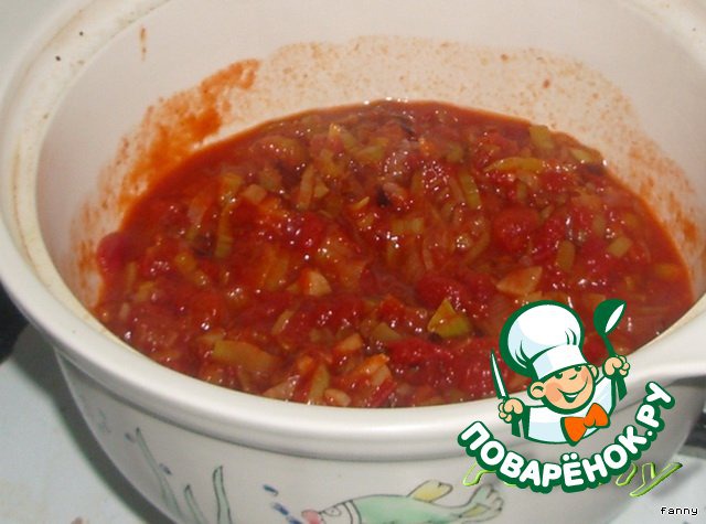 В кастрюлю, где будет готовиться гуляш, сложить лук с чесноком, размятые консервированные помидоры в соку, влить вино. Тушить 15 минут, не закрывая крышкой.