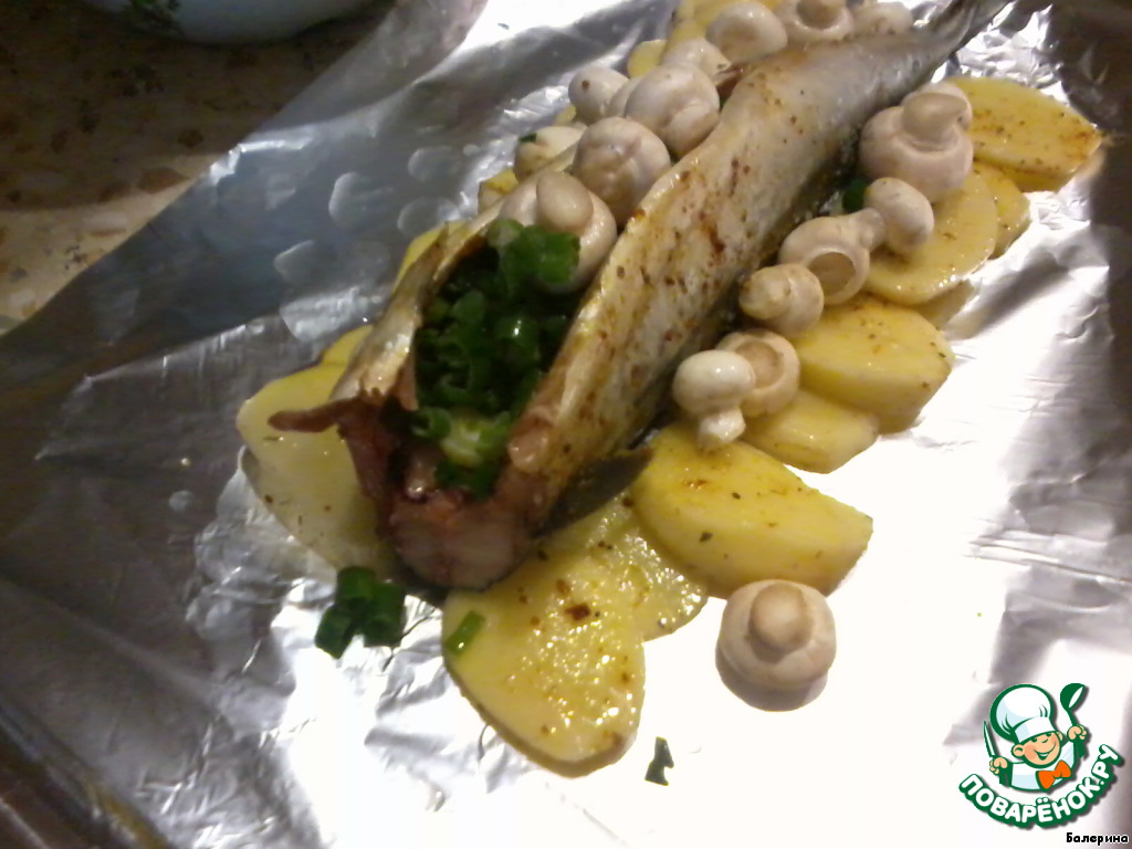 Берем противень. Устилаем его фольгой, кладем рыбку... вокруг нее картошечку, внутрь - лук и зелень, и грибочки сверху, сбоку... везде)))