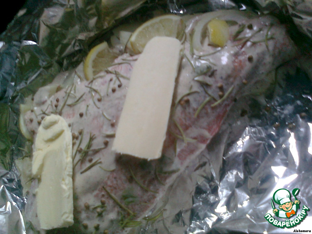 Рыбку выкладываем на противень, застеленный фольгой, в брюшко кладем зелень с чесноком, вокруг рыбки выкладываем лук и дольки лимона (можно и без него), сверху кладем кусочки сливочного масла и (по желанию) можно посыпать сухим розмарином. Я еще зернышек горчицы добавила.