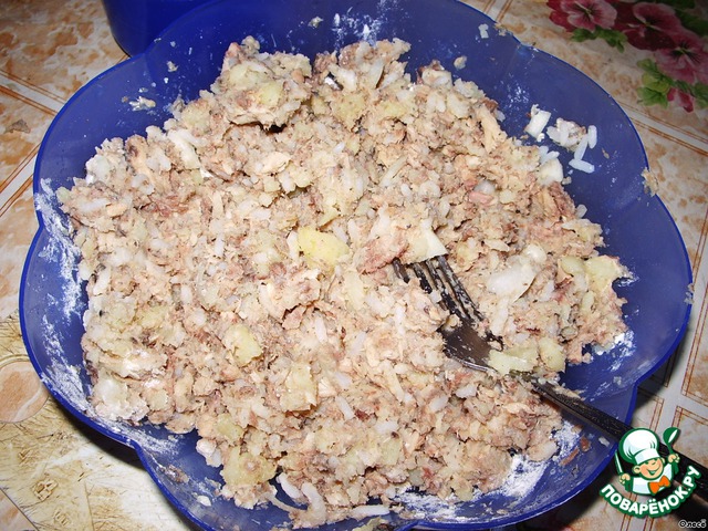 Картофель отварить в мундире, почистить, размять толкушкой.