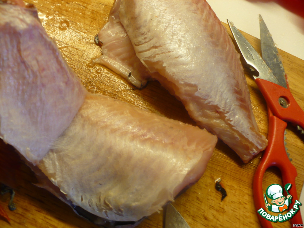 У меня были две тушки морского окуня. Чистить рыбу я не люблю. Поэтому, надрезав шкурку у плавников, просто сняла ее как чулок. Если процесс чистки рыбы вас не напрягает, то можете приготовить окуня и в шкуре.