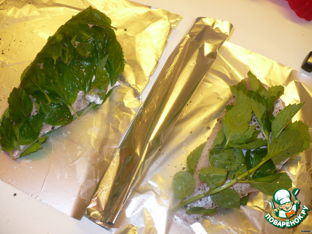 Далее совсем просто: рыбу укладываем на фольгу, солим, перчим и укрываем промытой мятой. Одну рыбу я накрыла просто веточками, а другую - только листиками.