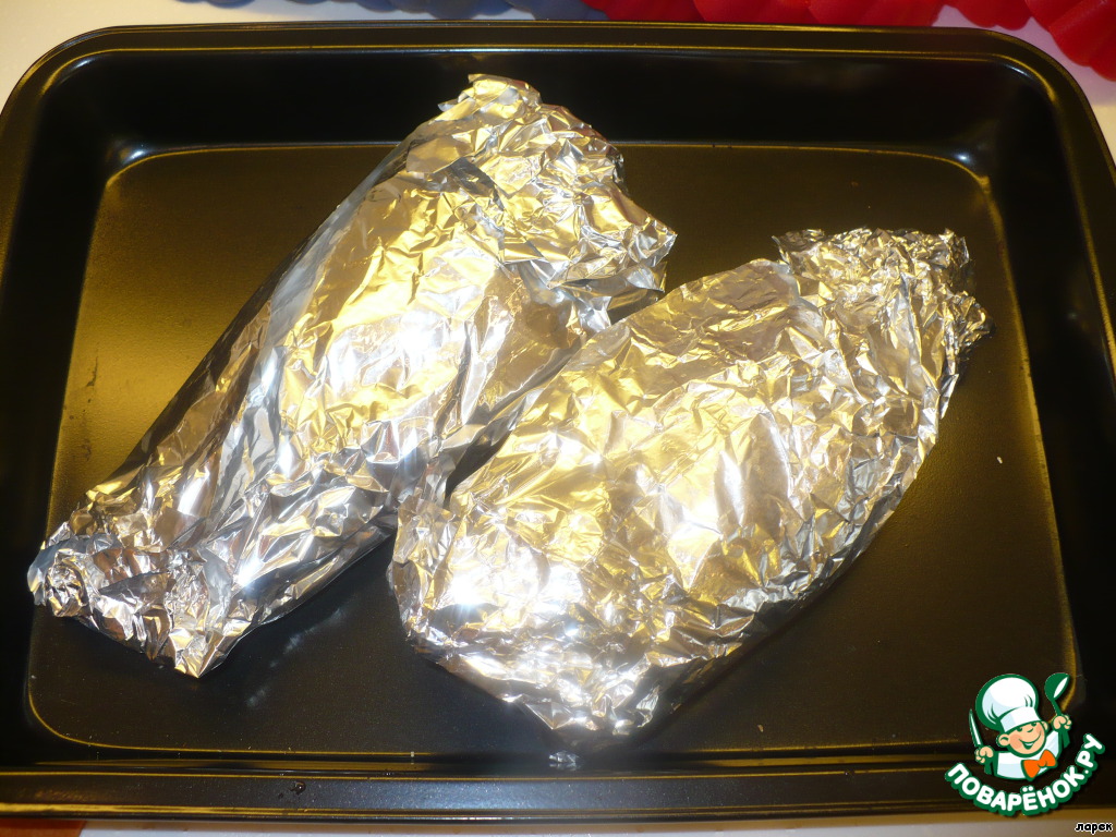 Заворачиваем в фольгу и на 30 минут в духовку при 200 градусах.