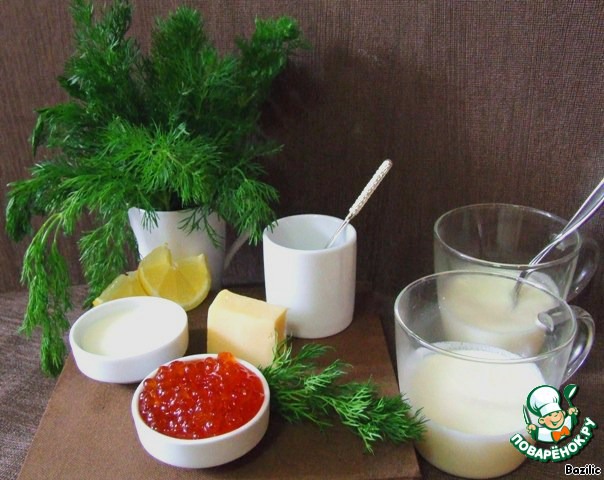5. Смешиваем сметану, майонез и сливки. Затем добавляем сливочное масло и плавленый сырок. Увариваем на небольшом огне до загустения, все время помешивая. Затем добавляем молотый красный перец и сок лимона. Когда соус уже почти готов, добавляем мелко нарезанный укроп и красную икру, еще немного подогреваем на слабом огне, не давая закипеть.