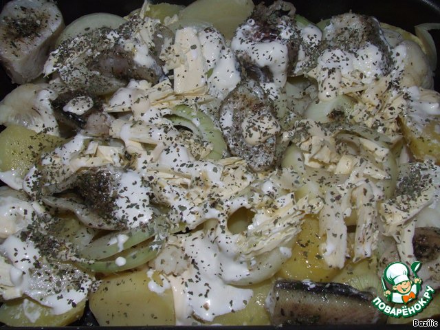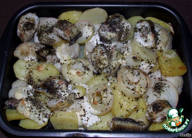3. Все составляющие выкладываем на противень и запекаем в духовом шкафу до румяной корочки (картофель, цветная капуста, рыба). Также добавляем нарезанный кольцами лук, сливочное масло (или оливковое) и немного сметаны.