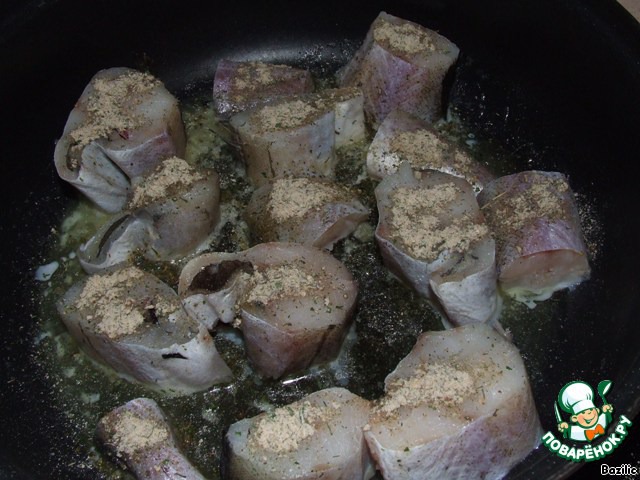 2. Рыбу немного обжарить с обеих сторон на сливочном масле (или оливковом), добавив специй.