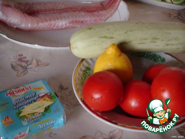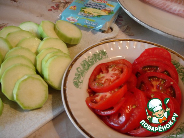 В посуду для запекания выкладываем рыбу, затем слой кабачков и помидоры.