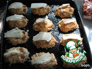 Сформировать из массы рыбок. Выложить их на смазанный противень. Сверху пластинки сыра (можно натереть сыр и выложить на рыбок). Глаза сделать из изюминок, или нарезать кружочками маслины.