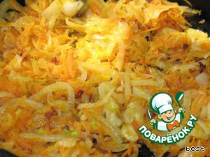 Лук нарезать полукольцами. Морковь натереть на крупной терке. Обжарить их на растительном масле.