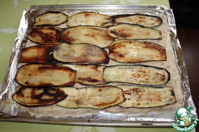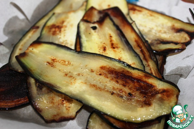 Баклажан нарежьте тонкими ломтиками, замочите в соленой воде и оставьте на 10 минут. Промойте, обжарьте до золотистой корочки на растительном масле. Переложите на бумагу, чтобы впитать лишний жир.