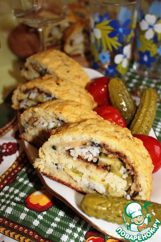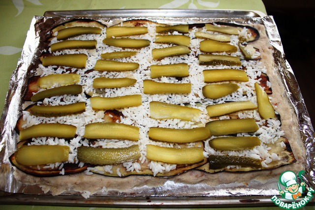 Рыбный рулет с рисом, баклажанами и маринованными огурцами