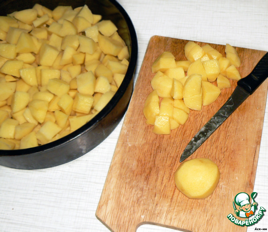 Картофель почистить, нарезать и положить в смазанную растительным маслом форму.