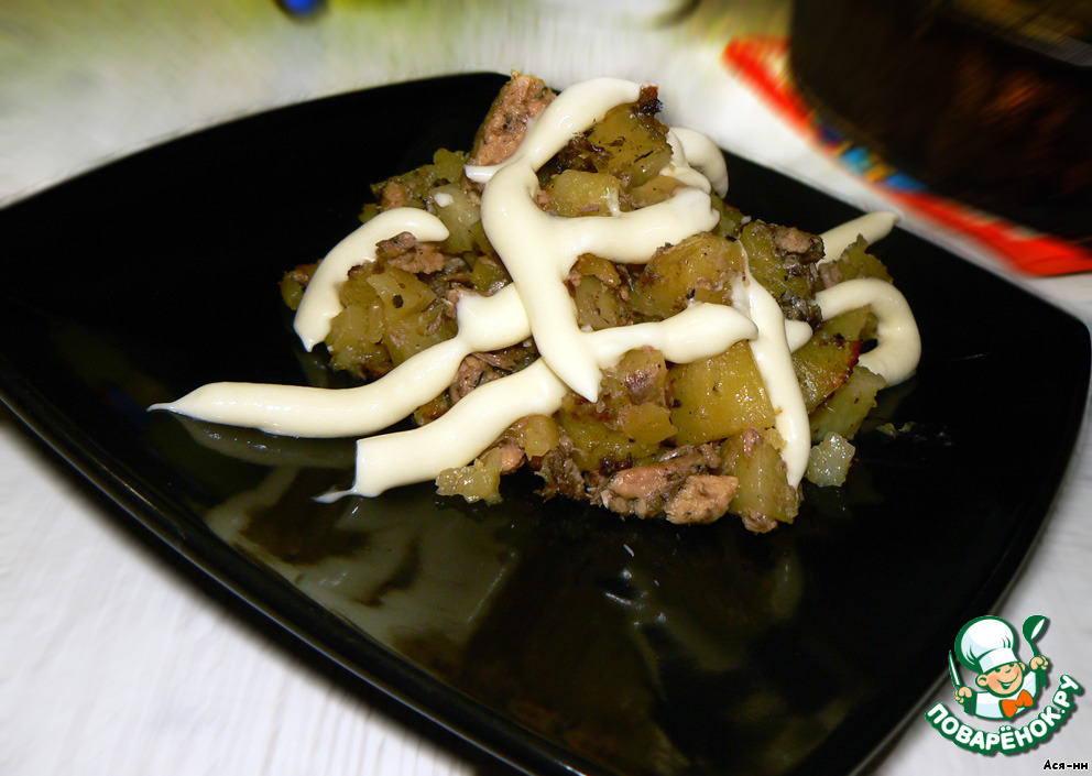 В картошку вылить получившийся соус, консервы измельчить вилкой, выложить в картошку, все перемешать. Закрыть крышкой, поставить в духовку, включить ее на максимум. Запекать примерно 40 минут.