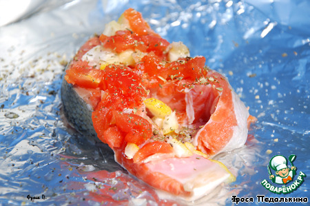 Положить в каждый квадрат стейк семги, сверху нарезанные помидоры, мелконарубленный базилик и лимон, приправить итальянскими травами по вкусу.
