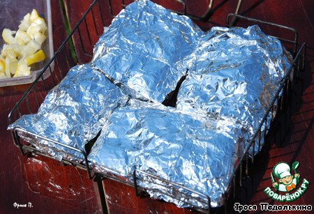 Фольгу завернуть конвертом и запекать на гриле по 5-7 минут с каждой стороны до готовности.