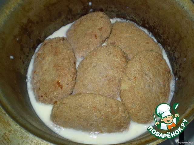 Все обжаренные котлеты сложить в небольшой казанок, залить стаканом горячего молока. Казанок поставить на средний огонь, плотно закрыть крышкой и первые 10 минут тушить под закрытой крышкой, затем крышку убрать и тушить до выпаривания молока.