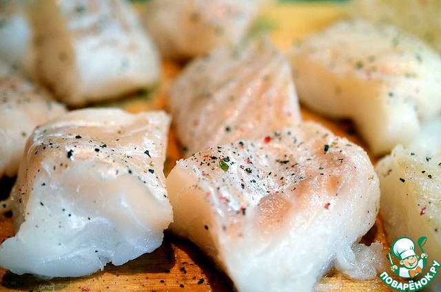Филе рыбы вымыть, обсушить, нарезать крупными прямоугольными ломтиками.