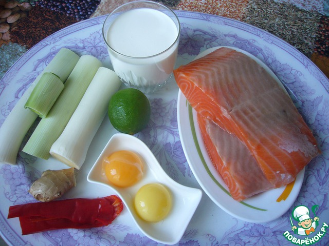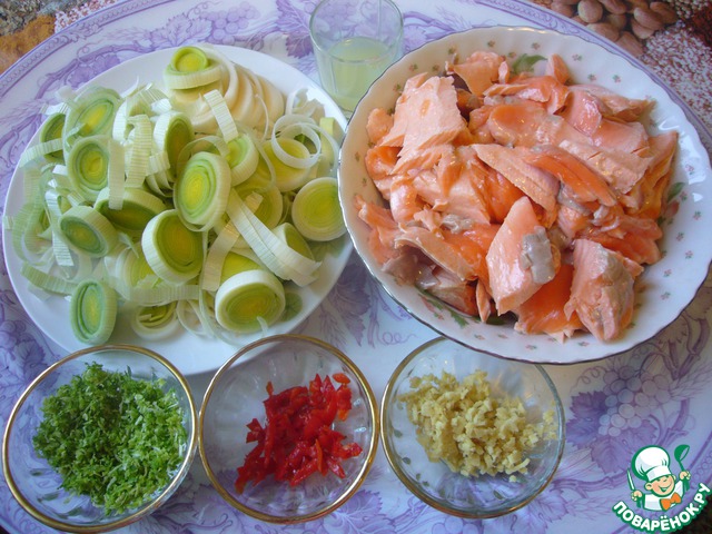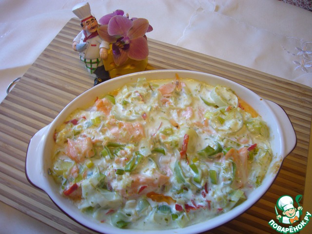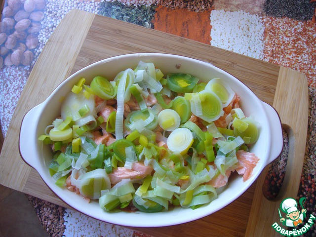Поместите форель и лук-порей в невысокую форму для запекания (я чередовала слои лука и рыбы). Влейте сливочный соус и поставьте в разогретую до 180*С духовку на 10 минут. Залитую соусом рыбу не сфотографировала, почему - не знаю, простите за ляп.