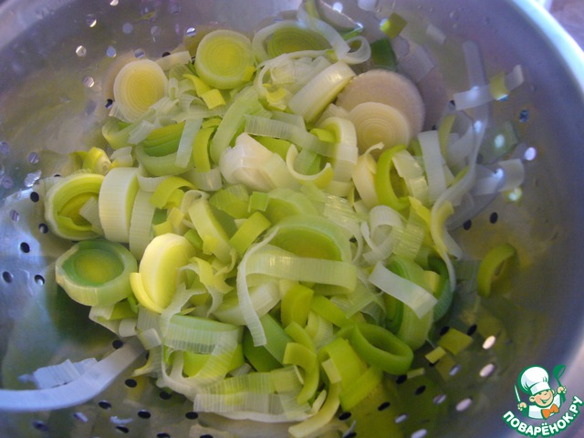 Тщательно промойте лук-порей и нарежьте его колечками толщиной приблизительно 0,5 см, положите в кипящую подсоленную воду и варите 4 минуты. Откиньте на дуршлаг, обсушите.