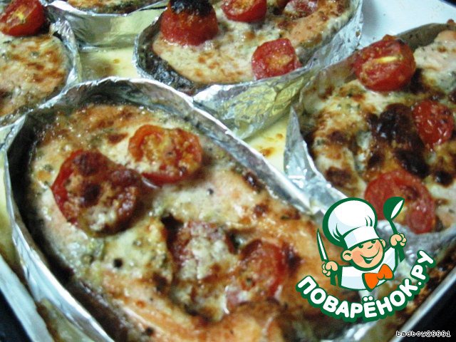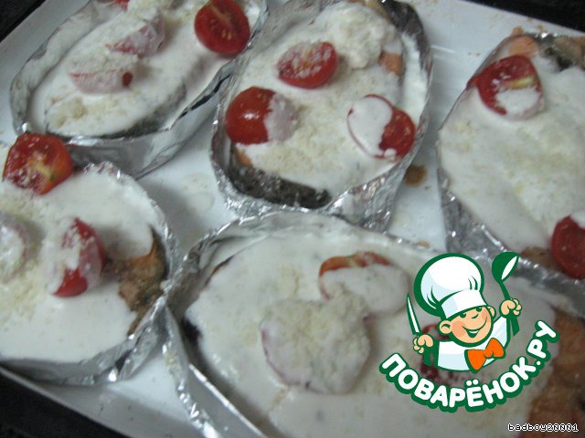 Кладем в тарелочки из фольги, выливаем оставшееся масло со сковородки, кладем для украшения помидоры и заливаем сливками. Сверху присыпать немного пармезаном.