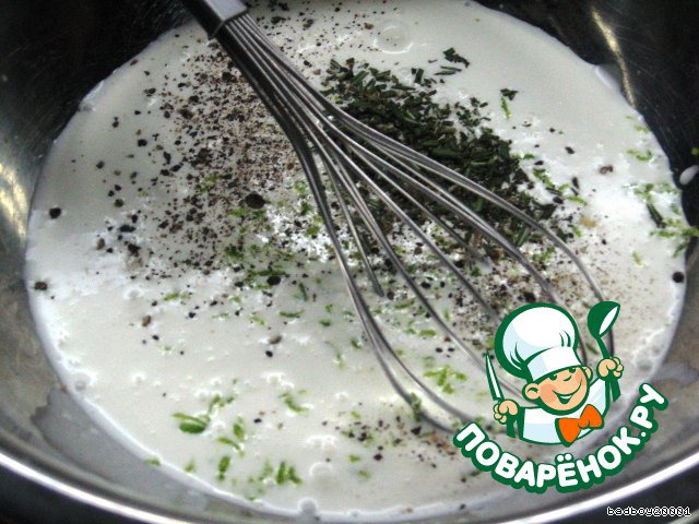 В сливки добавить мелко порезанный розмарин, цедру лимона, соль и перец, слегка взбить.