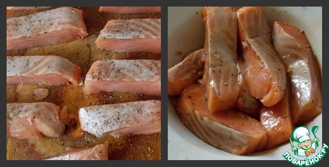 Рыбу можно замариновать как непосредственно перед жаркой (за 10-15 мин.), так и оставить ее на ночь. В моем случае это филе кеты, и мариновать я ее предпочитаю с вечера.