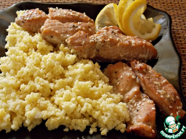 Включаем духовку. Берем форму для запекания или, как я, маленькую сковородку. Смазываем ее маслом и раскладываем наши рыбные брусочки. Поливаем остатками маринада. При желании посолим и посыпаем кунжутом. Он прекрасно подойдет к этому варианту рыбы. Как только после начала варки пшена пройдет 10 мин., ставим нашу рыбку в духовку на 10-15 мин. при t= 180. (Не пересушите).