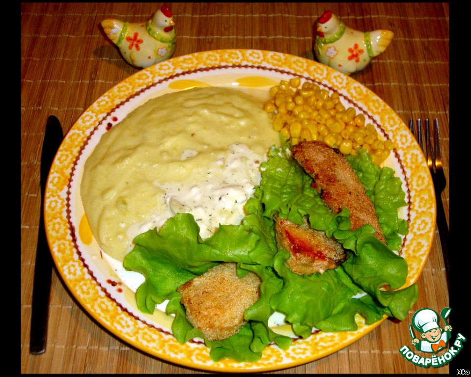 Получилось 4 порции по три брусочка рыбы. На гарнир сделала (раньше) картофельное пюре и соус белый, холодный.