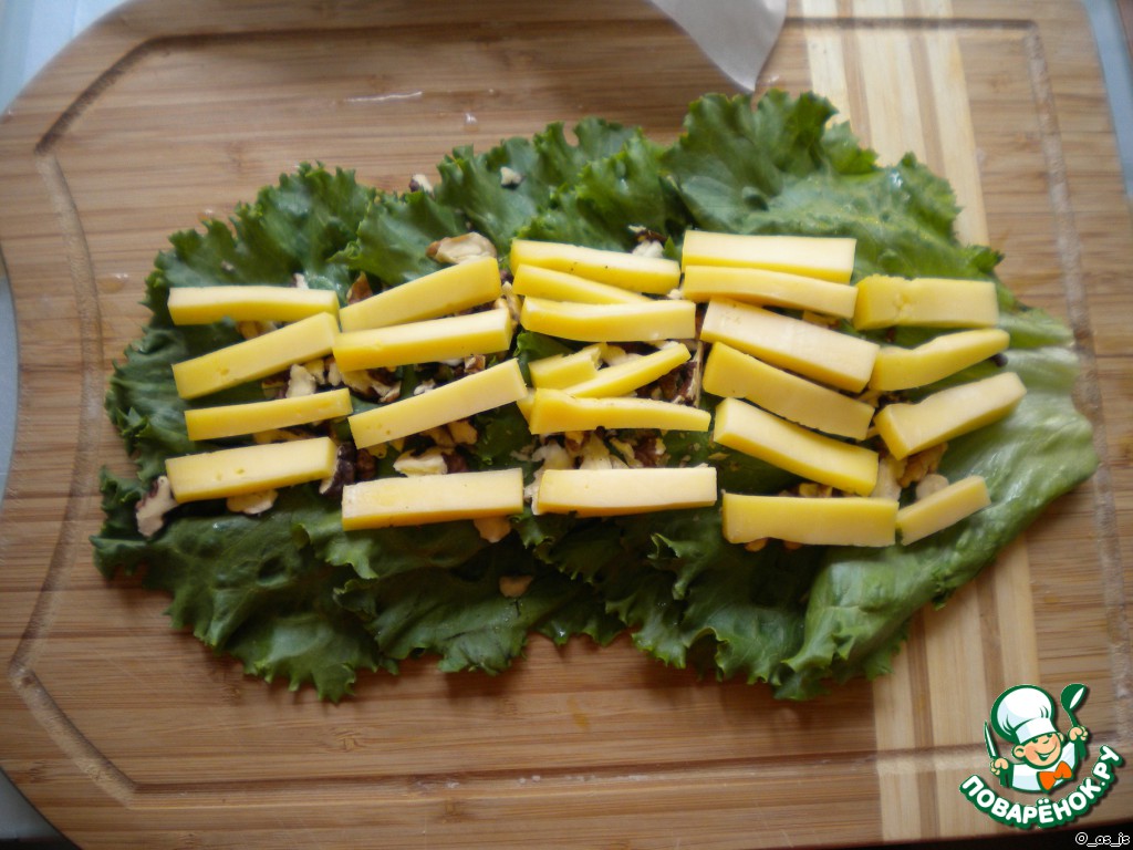 Сыр у меня жирный, поэтому его я нарезала среднего размера соломкой, орехи - крупно. Листья салата помыла, перебрала.