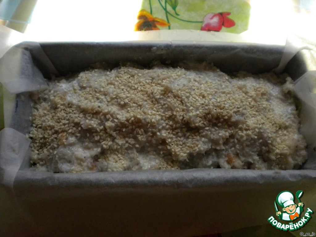Накрыла сверху оставшимся фаршем, смазала сверху сливками и присыпала кунжутом.