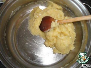 Для теста – Воду, масло и соль положить в кастрюлю и довести до кипения. Снять с плиты, всыпать муку и хорошо перемешать деревянной ложкой. Снова поставить на плиту, убавить огонь и дальше мешать, пока не образуется такой общий комок теста и на стенках кастрюли не будет теста