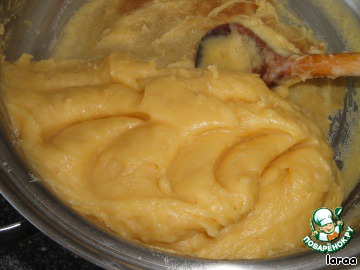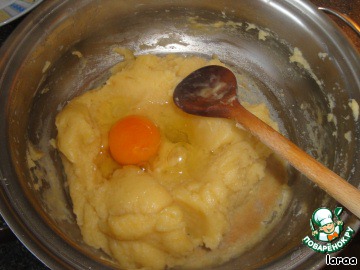 Снова снять с плиты и вбивать яйца по одному, хорошо перемешивая.