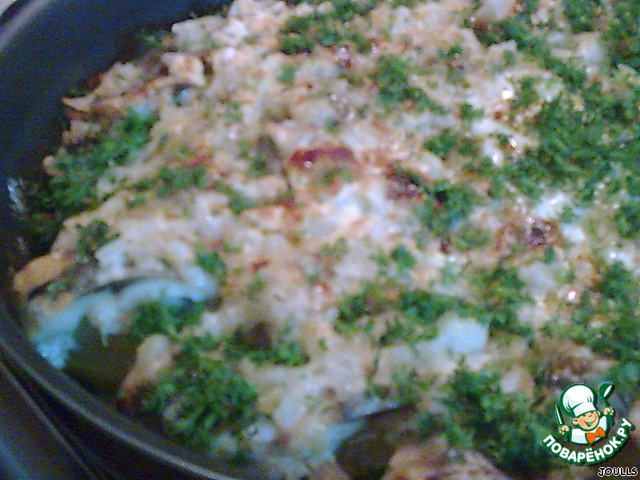 В это время разогреваем духовку до 200 градусов и взбиваем молоко с яйцами. Этой смесью заливаем картошку с рыбой и ставим в духовку, чтобы яйца затвердели. Я в конце включила гриль для румяной корочки.