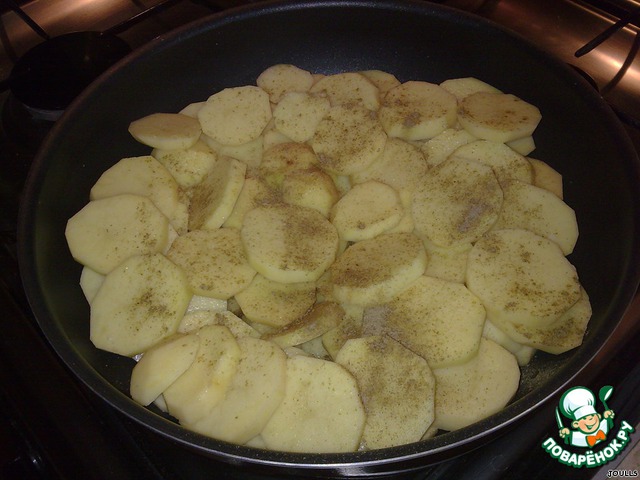 и выкладываем в смазанную жиром сковороду. Присолить. Я еще добавила смесь пряностей для рыбы.