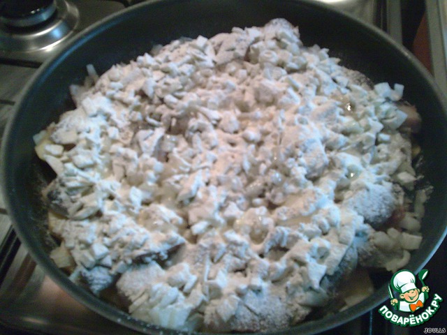 Сверку посыпаем мелко нарезанным луком, присыпаем мукой (я делала через маленькое ситечко, так получается равномернее), заливаем растительным маслом, солим, перчим...