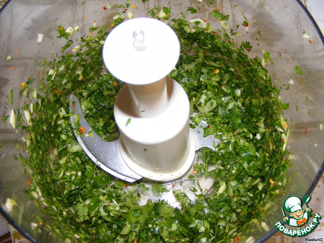 Кинзу, лук зеленый, чеснок и чили (у меня чили сухой) порубить в блендере.