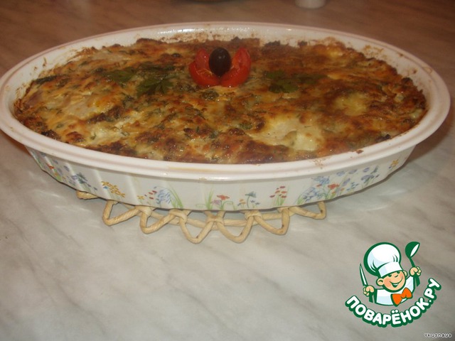 Запеканку украсить помидоркой черри, маслинкой и петрушкой.