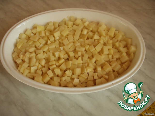 Выложить нарезанный мелкими кубиками картофель и посолить. Поставить в разогретую духовку.