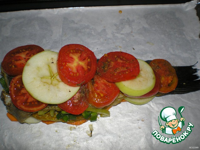 На рыбу – слой помидор и пару кружочков яблока. Помидоры посыпать перцем. Защепить края фольги и выпекать в разогретой духовке на второй полочке 20 минут.