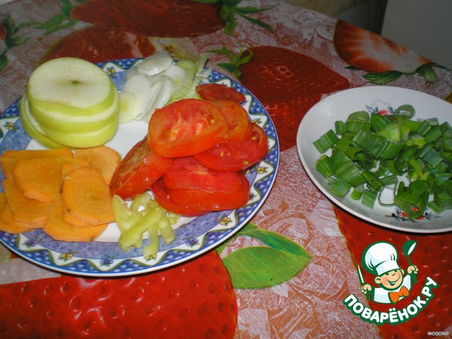 У перца удалить семена и нарезать соломкой. Лук – колечками. Помидоры с морковью (очищенной) – кружочками. У яблока удалить сердцевину и также нарезать кружочками. Сыр нарезать тоненькими ломтиками по длине рыбы (у меня уже нарезанные из магазина).