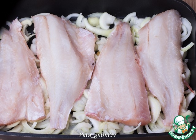 1. Лук нарезать полукольцами. Форму для запекания смазать маслом и выложить на дно лук. Если ваши домашние не любят варено-тушеный лук, тогда его стоит предварительно немного (пару минут) обжарить. Выложить на лук филе окуня.