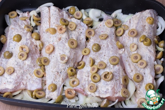 2. Сметану или йогурт смешать с розмарином, сушеным чесноком, молотым перцем чили. Можно взять готовую приправу для рыбы на свой вкус. Смазать филе сметаной со специями. Если необходимо, посолить по вкусу. Я совсем не досаливала, мне хватило соли из оливок и брынзы, но это дело вкуса. Сбрызнуть рыбу сверху лимонным соком и посыпать порезанными оливками.