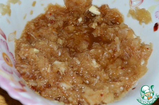 Лук и чеснок очистить, измельчить в блендере/мясорубке или просто натереть на терке. В луково-чесночную массу добавить водку, соевый соус, перец и соль все тщательно перемешать.