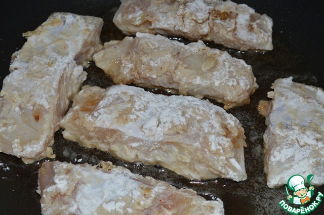 Промаринованную рыбу обвалять в муке и жарить на хорошо разогретой сковороде на среднем огне до золотистоой корочки.